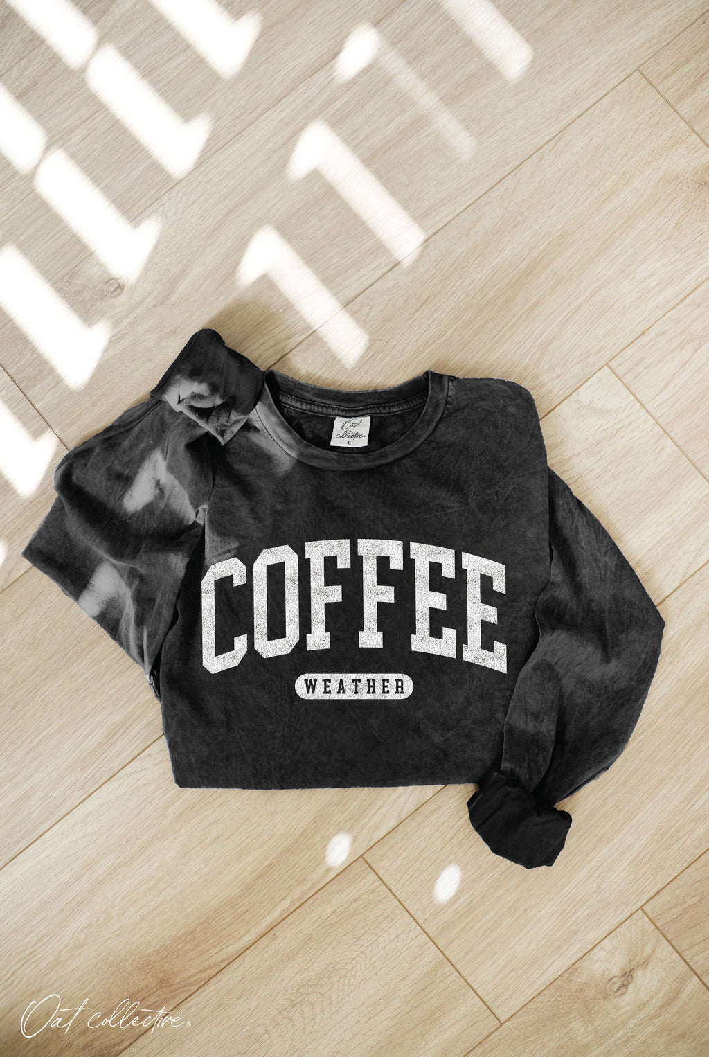 COFFEE WEATHER Mineral Washed Long Sleeve Graphic Top -100% Premium Cotton Jersey. -Relaxed Boxy Fit. -Cuffed Sleeves -Screen Printed with water based ink. -All items are slightly different because of the dying process of the garment. -Exclusive Oat collective Label.