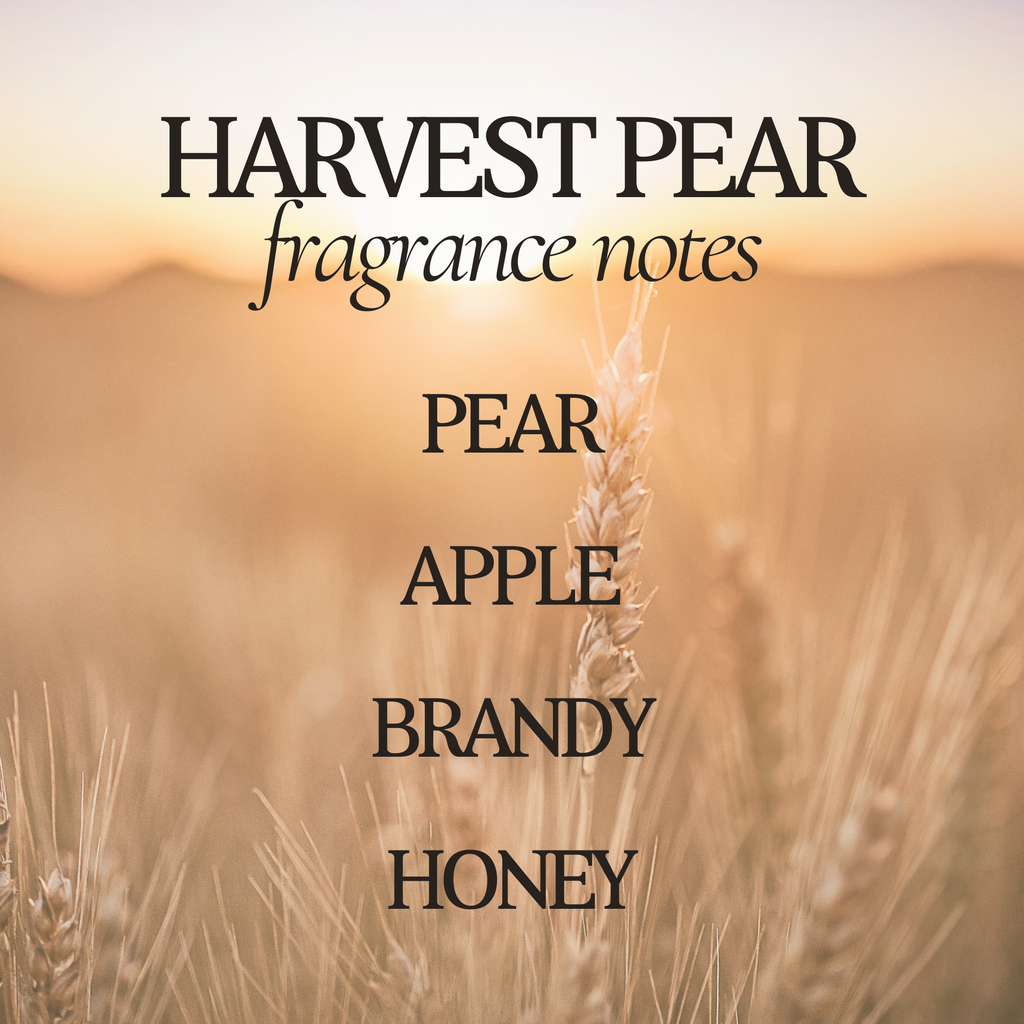 Step into an autumn orchard with Harvest Pear, where ripe pear and crisp apple mingle with warm touches of brandy and honey. A gentle hint of tonka bean and sugar rounds out this inviting fragrance, surrounding you with the richness of harvest season.