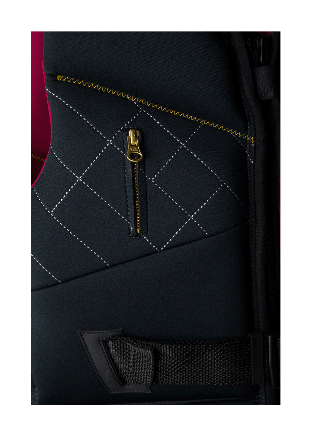 This vest has twice as much thickness in the upper chest segment as the lower region. The thin profile through your stomach makes it so much easier to crouch down for a well- executed wakeboard grab or to be in a more relaxed surf body position